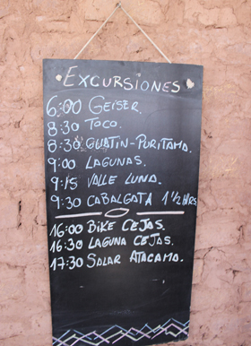 Todos os dias são oferecidas sugestões de passeios e excursões que permitem ao visitante interagir com a natureza, vivenciar a cultura do Chile e degustar as experiências da vida local. Entre elas, passeios de bicicleta guiados até a bela Laguna Cejar, formada por camadas de sal; caminhadas para apreciar o pôr do sol, café da manhã reforçado no Geiser del Tatio e cavalgadas de diferentes graus de dificuldade pelo antigo caminho a San Pedro do Atacama.